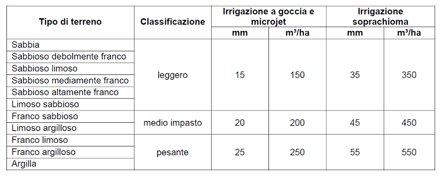 Da quest’anno i volumi massimi di seguito riportati previsti in funzione del tipo di terreno devono essere rispettati per ogni intervento irriguo non soltanto per l’irrigazione soprachioma, ma anche per altri metodi d’irrigazione: